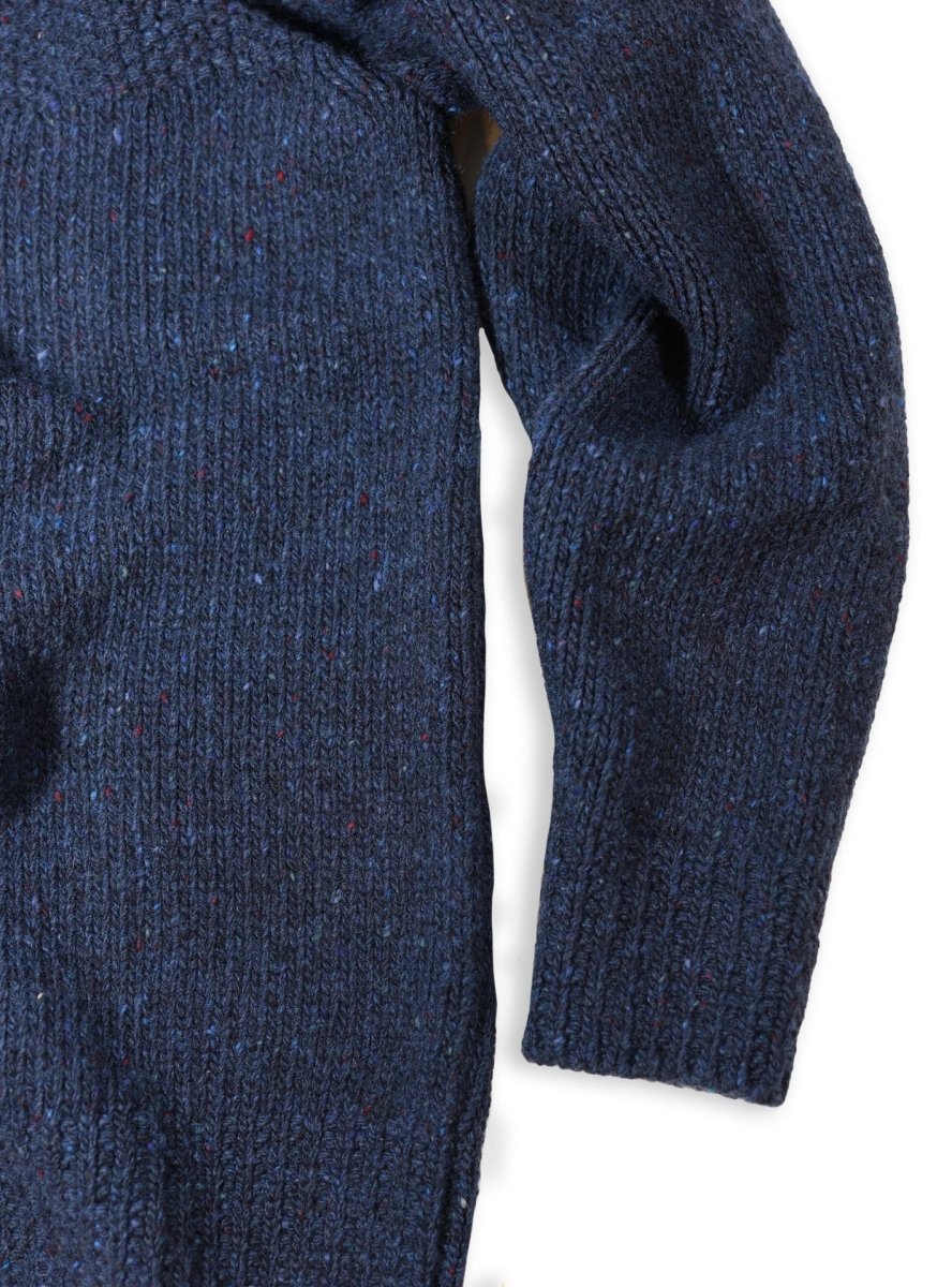 our Maine Lobstermen’s Sweater is more like a piece of outerwear than it is a sweater. Either way, it becomes part of your life not just your wardrobe. Weighing roughly 2 ½ lbs, this beast of a sweater is knit using two-ply, 100% pure Merino wool yarn spun in Donegal, Ireland, from native sheep. The 1x1 jersey stitch is knit with heavy tension applied as are the cuff and hem.