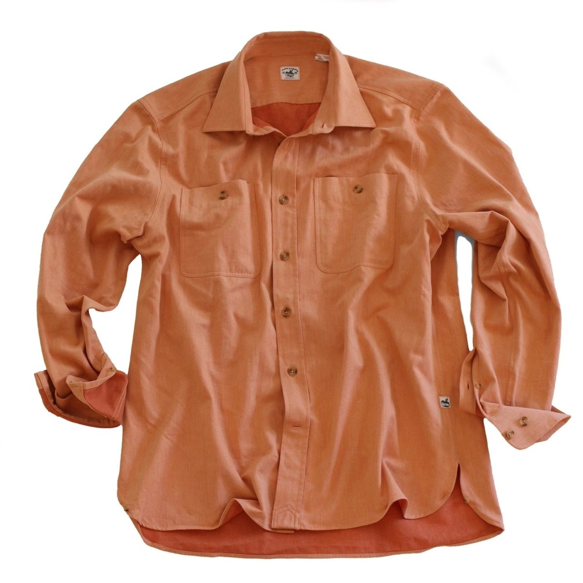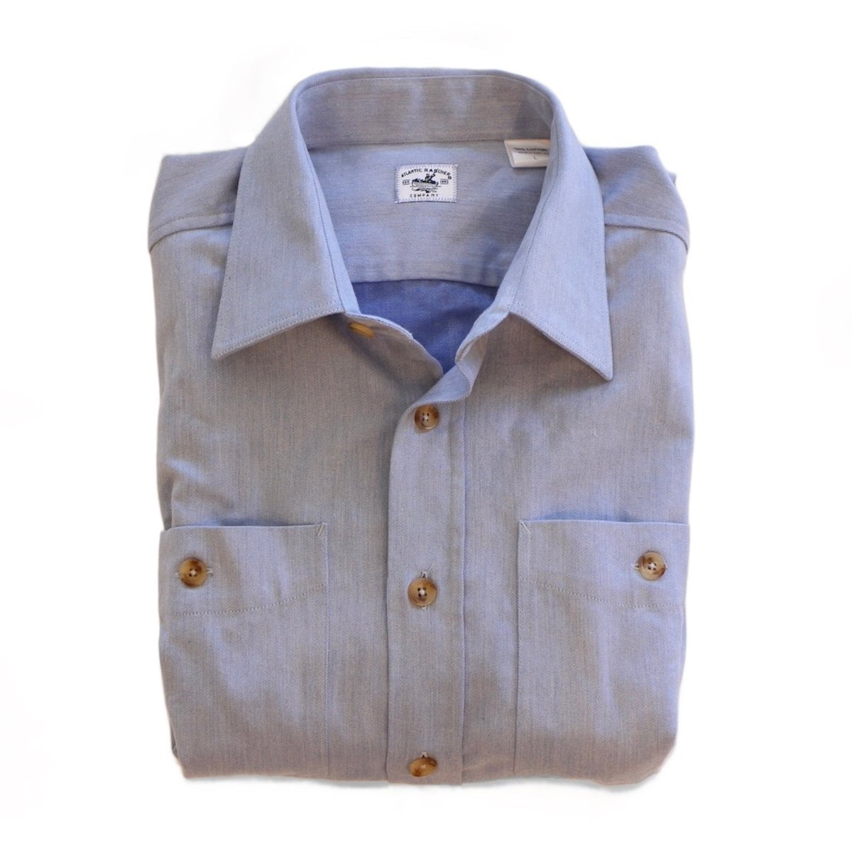That shirt was a near permanent fixture on my Garvey, laid flat to dry on foredeck day after day… it saw more fresh water from squalls than it ever did from the laundromat. And it’s that vintage, well-worn, salt marred patina it developed over the summer months that, I became hellbent on recreating in a fabric for one of our early Atlantic Rancher, circa 1996, cotton twill shirts.