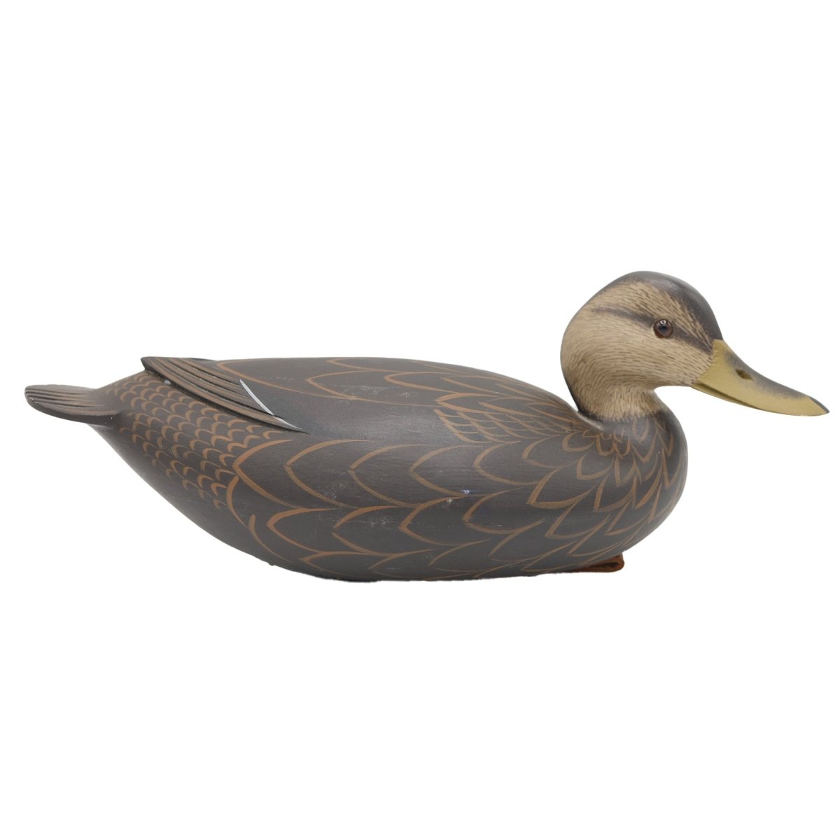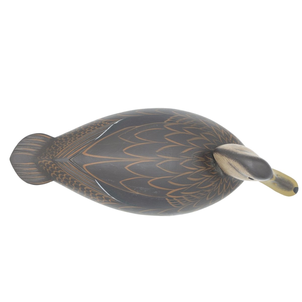 VERY FINE BLACK DUCK by Frederick C. Brown, Jr., Pt. Pleasant, NJ. Very good original paint and structural condition. Very small area of sap bleed under tail. Hollow construction. Raised, carved wing tips and fluted tail carving. Painted feather detail overall. Slightly turned head retain glass eyes. Retains pad weight and leather rigging. Signed by maker. Overall length is approximately 14 1/2 inches.