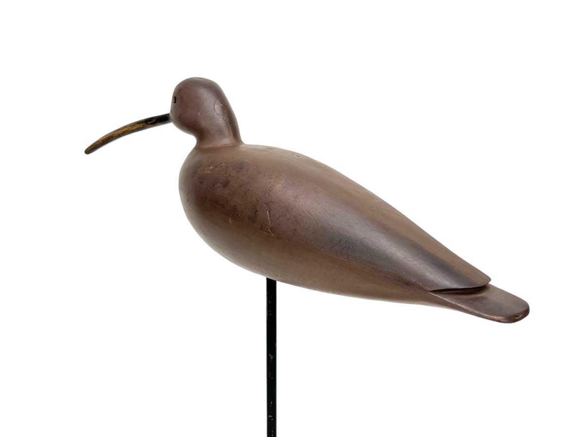 Hurley Conklin (1913-1983) Manahawkin, NJ 17" long Fine condition and very interesting five-piece shorebird for this maker. The decoy body is made of two hollow halves that come together lengthwise. A top that sits a two-piece head carved in the same manner, with a long bill splined through the back of the head. Condition: Near mint, a couple small, tiny paint flakes where the bill meets the face and a couple tight paint lines where the body and head seams are.