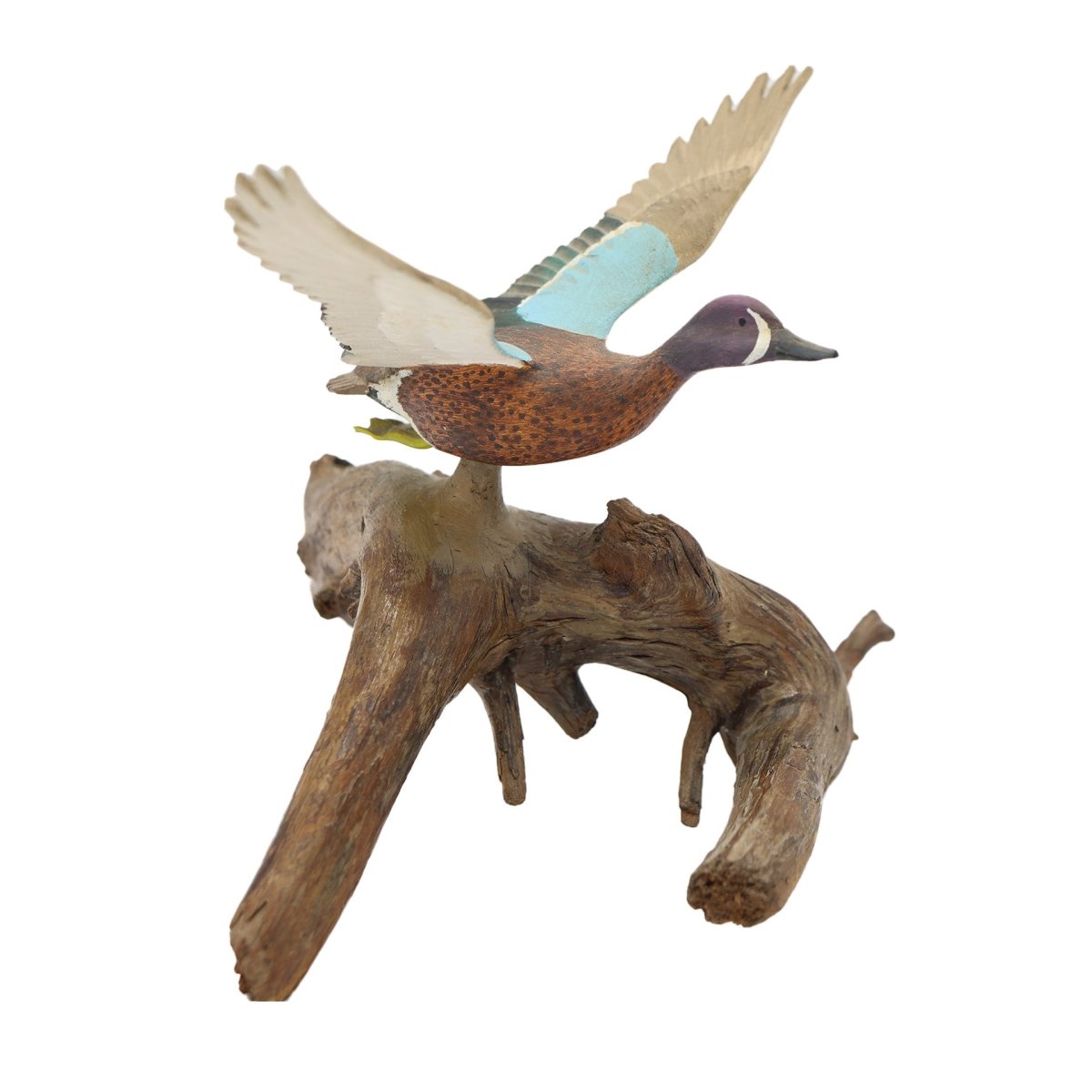 MINIATURE FLYING BLUE WING TEAL DRAKE, by Charlie Beer, Beach Haven, N.J. Very good original paint and structural condition. Outstretched wings with detailed feather carving. Tail with fluted carving detail. Paint ticking to body. Retains painted eyes. Extended metal feet. Maker's name carved in base. Overall length of carving is approximately 5 1/2 inches. Wing span approximately 10 inches.