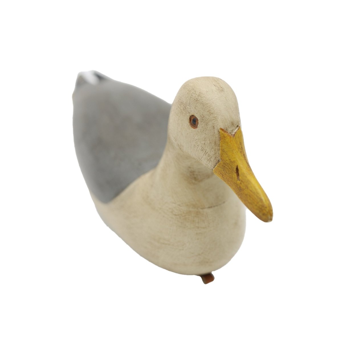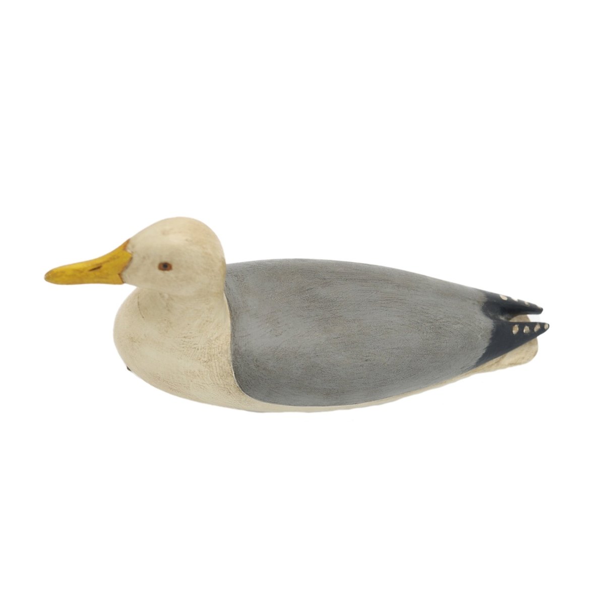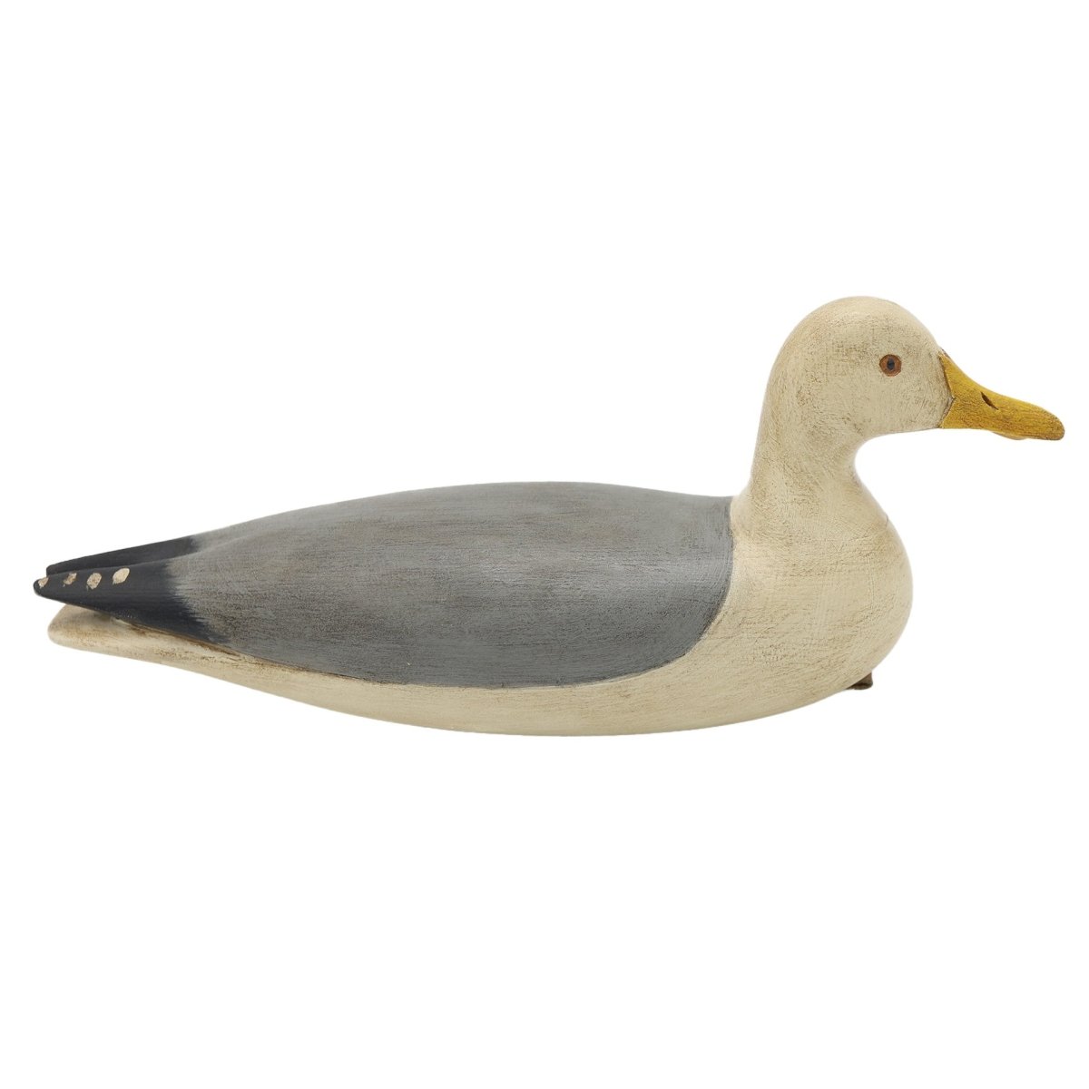 MINIATURE GRAY-BACK GULL by Bob Seabrook, Absecon, NJ. Excellent original paint and structural condition. Hollow construction. Relief-carved wings and raised wing tips. Retains glass eyes, leather rigging and inlet weight. SEABROOK etched in bottom. Overall length is approximately 9 1/2 inches.