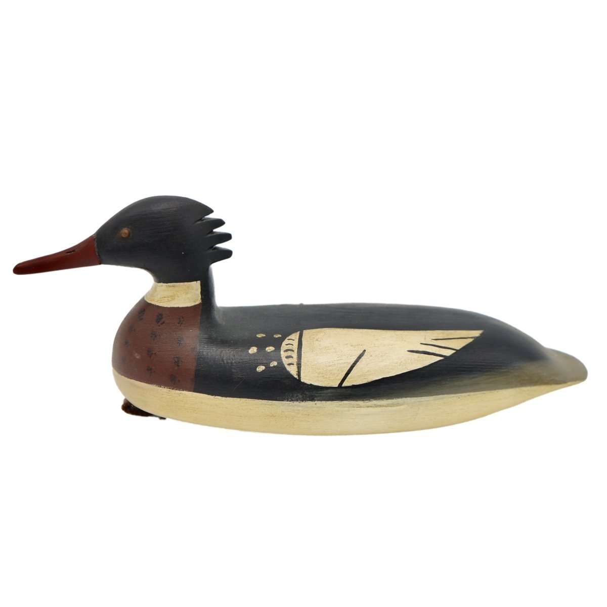 MINIATURE RED-BREASTED MERGANSER Drake Decoy by Bob Seabrook, Absecon, NJ. Excellent original paint and structural condition. Hollow construction. Head with tiny tack eyes and carved crest. Carved nostril detail to bill. Retains inlet weight and leather rigging. SEABROOK etched in underside. Overall length is approximately 8 1/2 inches.