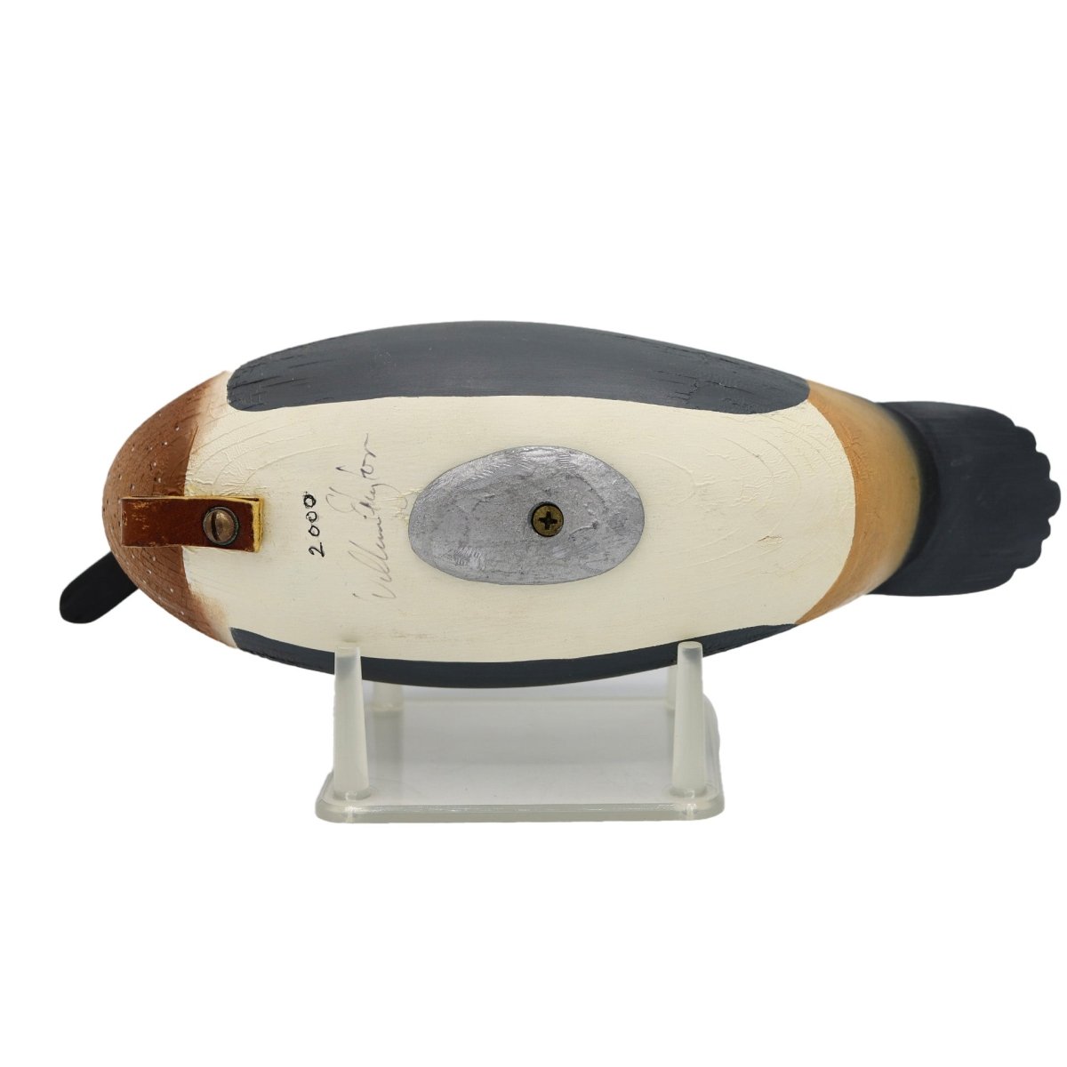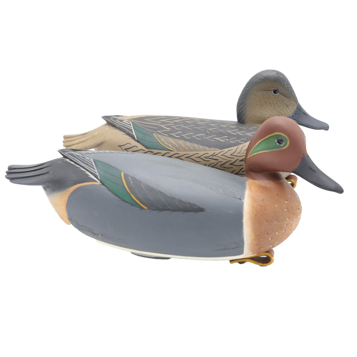 PAIR OF GREEN WING TEAL by William Ethington, Columbus, NJ. Good original paint and structural condition. Drake with paint shrinkage to lower half of body. Hen with paint shrinkage under breast. Raised wing tips and fluted tail carving. Drake's head slightly turned. Hen with nice painted feather detail to back and sides. Paint ticking to head. Both retains glass eyes and carved bill detail. Both retain oval weights and leather rigging. Both signed by the maker and dated 2000.