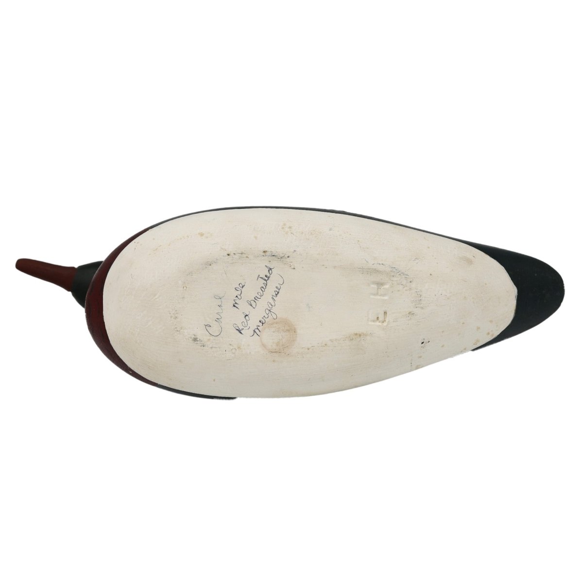 FINE PAIR OF RED-BREASTED MERGANSERS by Eugene Hendricks, Brielle, NJ. Very good original paint and structural condition. Some areas of discoloration to both. Hollow construction. Sleek models with slightly turned heads and carved crest detail. Both retain glass eyes. Both branded EH. Overall length is approximately 14 1/2 inches.