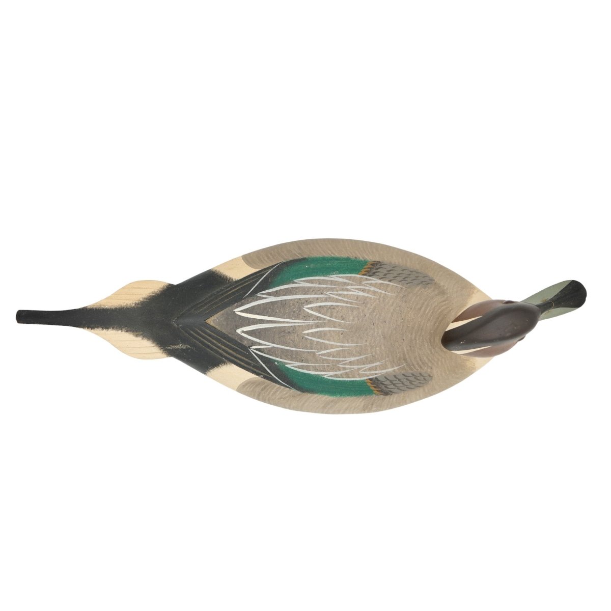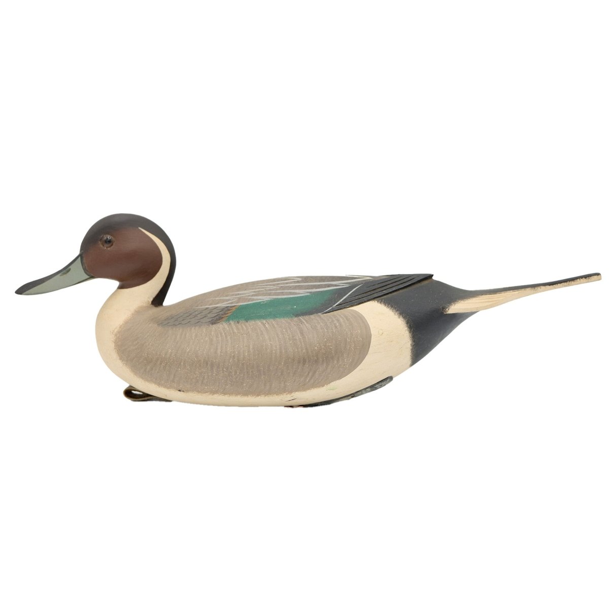 PINTAIL DRAKE Duck Decoy by Frederick C. Brown, Jr., Pt. Pleasant, NJ. Very good original paint and good structural condition. Bill crack reset. Hollow construction. Painted feather detail to back and sides. Raised carved wing tips and fluted carving to tail. Head slightly turned. Retains glass eyes, pad weight and leather rigging. Signed by maker and dated 1998. Overall length is approximately 16 inches.