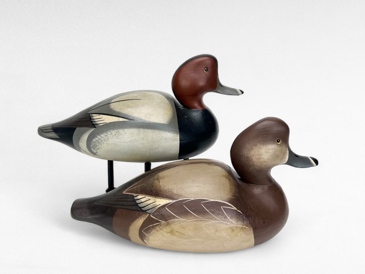 Hollow carved, Redhead Duck Decoys. They have glass eyes and turned heads. Rigged on the underside with an applied lead pad weight and leather line tie.
