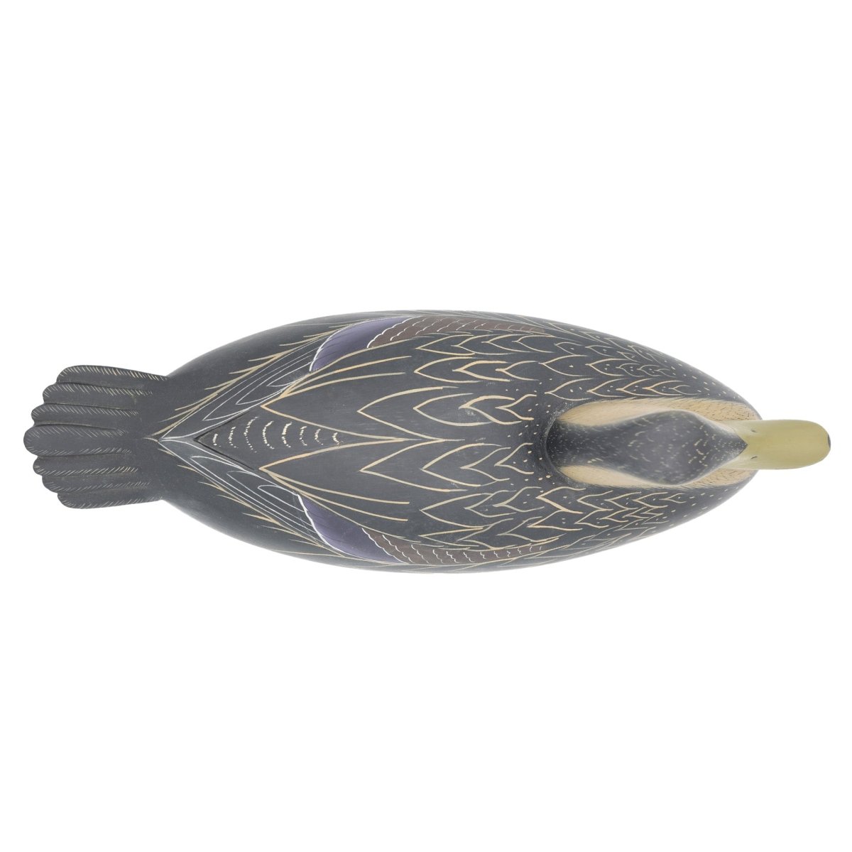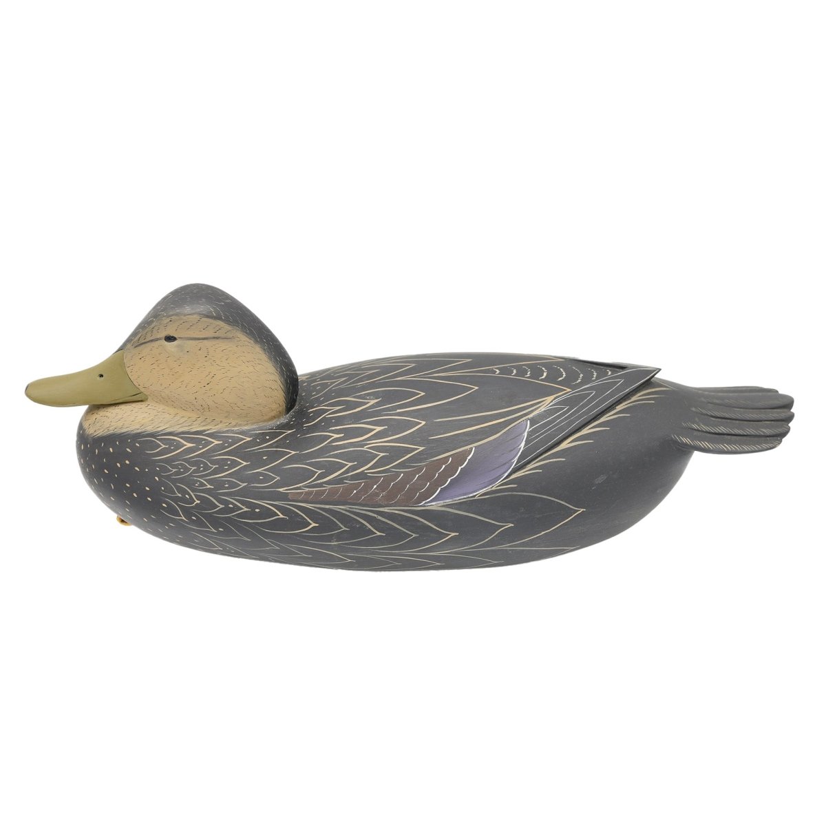 OUTSTANDING SLEEPING BLACK DUCK Decoy by William Ethington, Columbus, NJ. Excellent original paint and structural condition. Hollow construction. Delaware River model with snug head. Very detailed painted feather work over entire back and paint ticking to head and lower neck. Raised wing tips and fluted tail carving. Retains half-closed glass eyes. Bill with nostril and mandible carving. Retains weight with maker's impressed "E" and leather rigging. Dated 5/30/71. Overall length is approximately 15 1/2 inches. Outstanding in all respects!